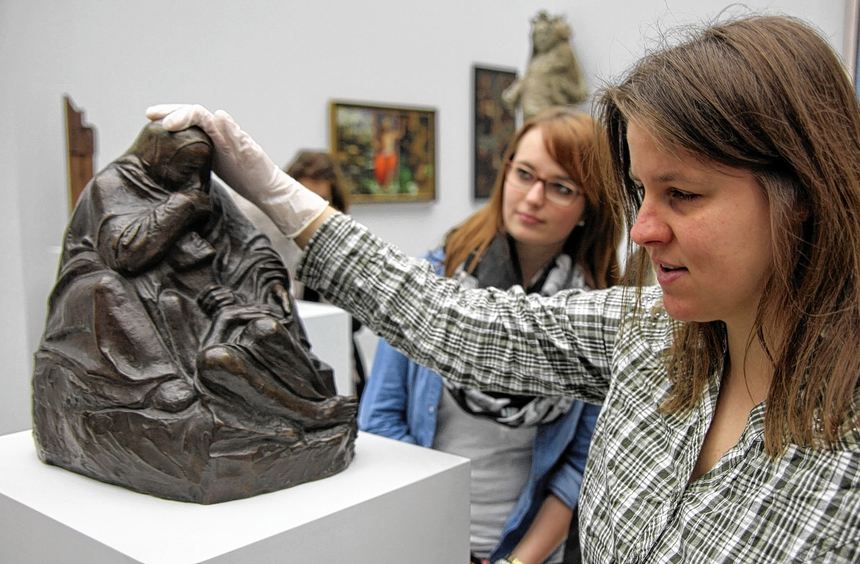Wenn Marion Peterreins vor einem Kunstwerk steht, dann sieht sie – erst einmal nichts. Außer hell und dunkel nimmt die von Geburt an blinde Frau nichts wahr. Doch wenn sie ein Kunstwerk anfassen kann, erwacht es unter ihren Händen zum Leben. Behutsam berührt ihre Hand, die in einem hauchdünnen Handschuh steckt, die „Pièta“ von Käthe Kollwitz. „Man fühlt die Kälte der Bronze“, sagt sie. Millimeter für Millimeter tasten ihre Hände die Skulptur ab. „Hier ist der Arm, hier die Finger, die Beine vom Kind. Die Figur hat eine gebeugte Haltung. Sie trägt etwas Faltiges. Ein Gewand.“ Kein Detail entgeht der jungen Frau.
