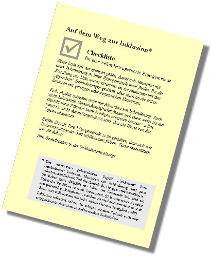 Wir danken besonders auch den Kolleginnen und Kollegen der Behindertenseelsorge in den Bistümern Bamberg und Eichstätt, deren Vorlagen und Ideen mit in diese Checkliste eingeflossen sind. Namentlich Pfarrer Siegfried Firsching und Frau Ursula Pöllmann-Koller (Erlangen), sowie Pfarrer Alfred Grimm (Eichstätt).