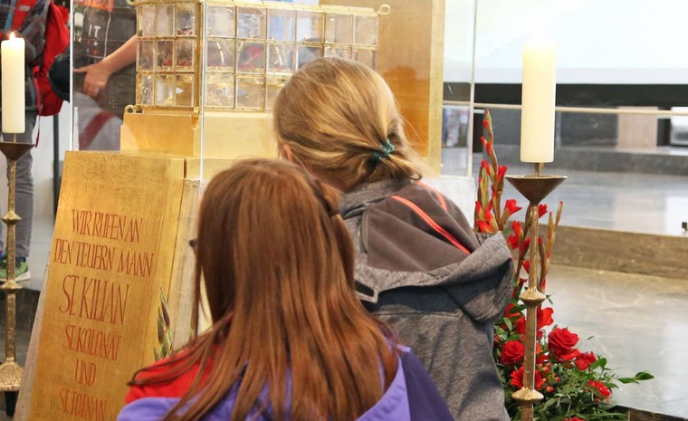 „Gott ist wie dieser gute Hirte. Er führt uns dahin, wo es uns gut geht“, erklärt Weihbischof Boom den Kindern. Manchmal sei man wie dieses eine Schaf, das wegläuft, weil es genug hat von „dem Mief im Stall“ und mal etwas anderes sehen will. „Und dann geht es nicht mehr weiter und es hört uns keiner, da mögen wir noch so laut schreien. Aber einer, der uns immer hört und immer sucht, ist Gott.“ Gott liebe die Menschen so sehr, dass er die schwersten Wege gehe, wo alles wehtut, bis ans Kreuz, erklärt der Weihbischof. Das habe auch Paulus zum Timotheus sagen wollen: Er solle nicht verzagt sein. „Habt einen Geist der Liebe, habt einen Geist der Kraft, weil Gott bei Euch ist, und habt einen Geist der Zuversicht, selbst wenn es ganz dunkel wird.“ Gott sehe die Menschen und lasse sie nicht verloren gehen. „Ich wünsche Euch, dass Ihr das immer wieder erlebt und erfahrt.“ Auch Kilian, Kolonat und Totnan hätten den Geist der Kraft, der Liebe und der Zuversicht in ihren Herzen gehabt, schlägt Weihbischof Boom den Bogen zu den Frankenaposteln. „Ich wünsche Euch allen, dass wir diesen Geist des heiligen Kilian ganz tief in unserem Herzen haben.“