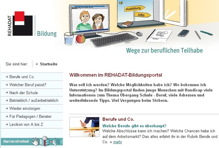 Ein besonderer Bereich widmet sich dem Übergang von Schule zum Beruf. Hier findet sich neben den bundesweiten Adressdatenbanken auch eine gute Information über die unterschiedlichen Förderschulsysteme in den einzelnen Bundesländern.