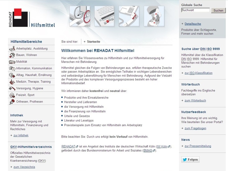 Auf www.rehadat-hilfsmittel.de sind mehr als 21.000 Produkte nach Bereichen wie Arbeitsplatz, Mobilität, Haushalt oder Kommunikation gruppiert und detailliert beschrieben. Bilder, Produktmerkmale, Hersteller- und Vertriebsadressen werden genannt. Ergänzt werden die Inhalte durch zahlreiche Gerichtsurteile (z.B. Kostenübernahme), Literatur (Testberichte), Praxisbeispiele (zum Einsatz von Hilfsmitteln am Arbeitsplatz) und Adressen (Beratungsstellen). Besonders hilfreich ist die Infothek. Sie enthält praxisorientierte Hintergrundinformationen dazu, wie man an das gewünschte Hilfsmittel kommt und wie die Finanzierung geregelt ist.
